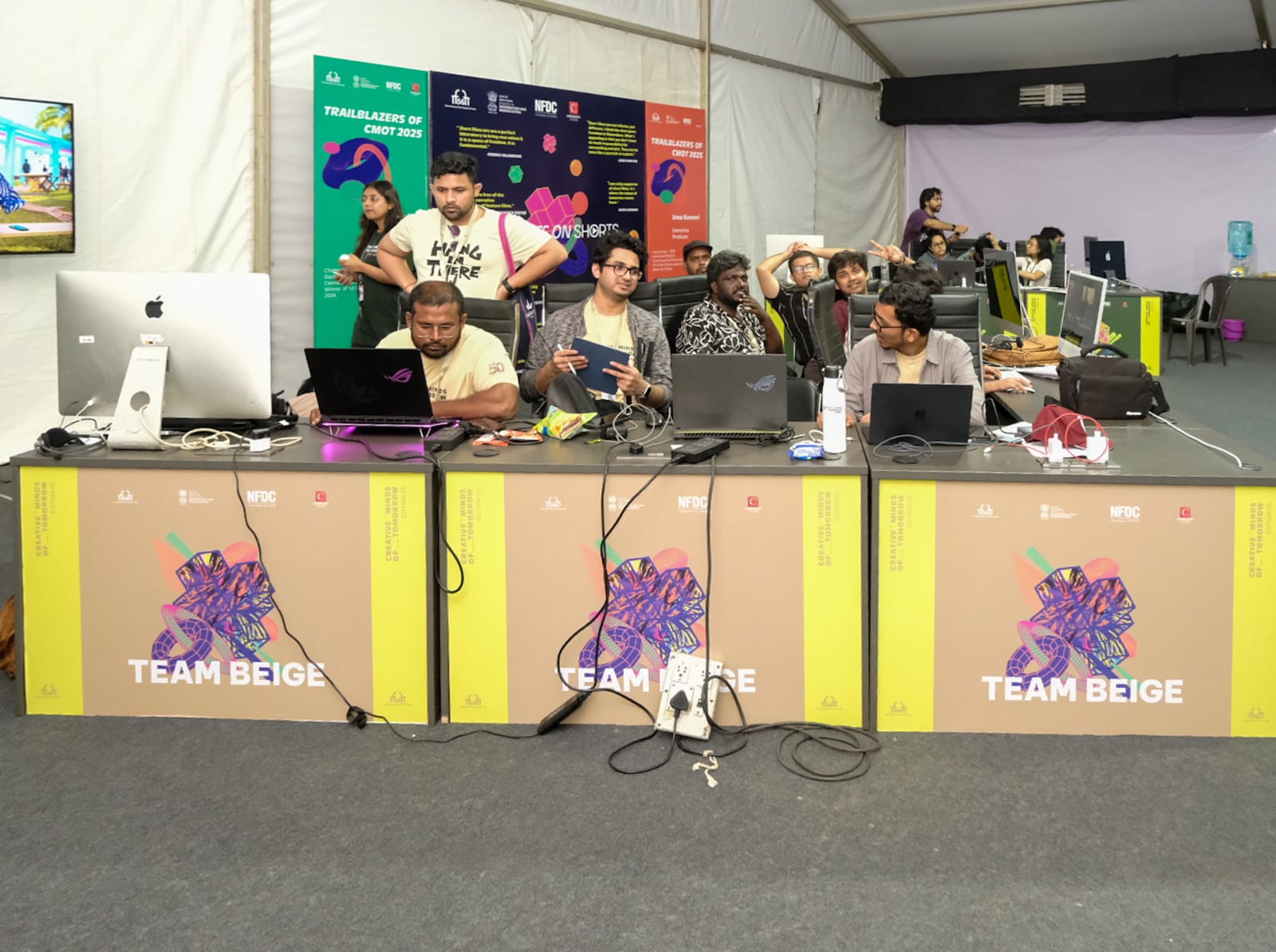 This year CMOT contest was held in a newly created CMOT hub outside Kala Academy. The contest was kick started by Minister of State, Dr. L. Murugan at 10AM in the presence of Sanjay Jaju, IAS, Secretary/Ministry of I&B, Dr. Ajay Nagabhushan NM, IAS, Joint Secretary (Films)/Ministry of I&B, Parkash Magdum, IIS, MD/NFDC, Gautam Bhanot GM(IFFI)/NFDC, Ajay Dhoke, GM(CMOT)/NFDC, and Carter Pilcher, CEO/Shorts TV London. This year the number CMOT has increased from 100 to, 128 which were divided into 5 groups each group having 25/26 CMOT. These teams were allotted different colours like, beige, orange, blue red and green.