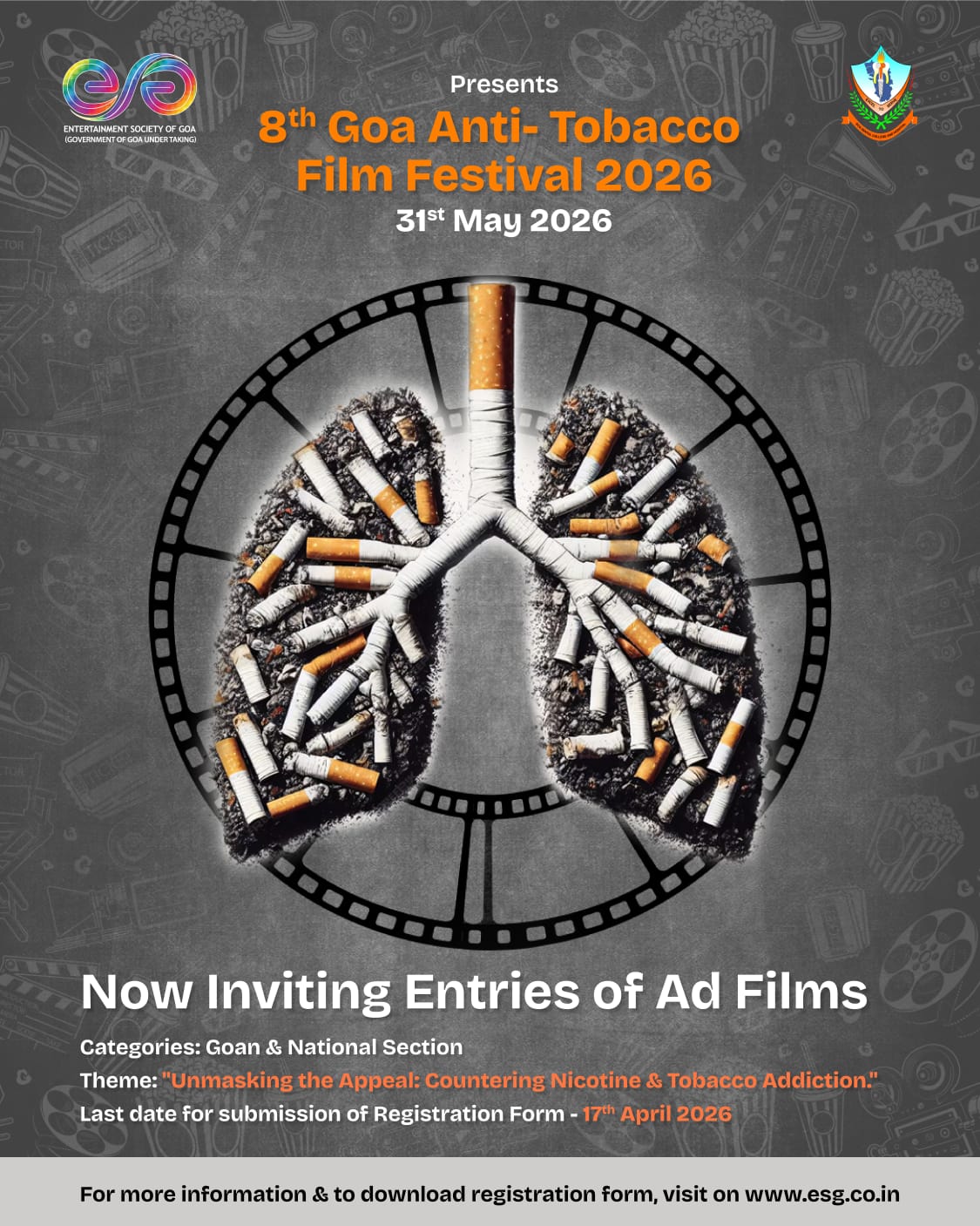 Entertainment Society of Goa in association with the Department of Public Health Dentistry, Goa Dental College and Hospital will organise the 8th Goa Anti-Tobacco Film Festival on 31st May 2026.
