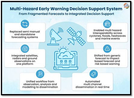 The Multi-Hazard Early Warning Decision Support System represents a decisive transformation in India’s approach to weather forecasting and disaster risk reduction. By integrating real-time observations, advanced modelling, GIS-based analysis, and structured dissemination within a single digital framework, the system converts weather and climate information into timely, preventive action.