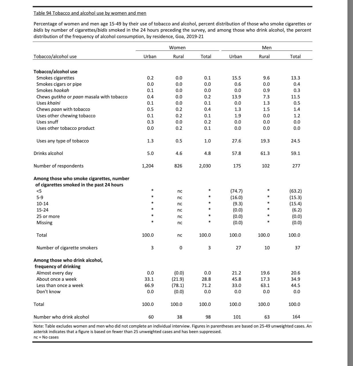 The recently-released National Family Health Survey-5 (2019–21) has reported that 11.5% of men in Goa chew gutkha or paan masala with tobacco, and about 24.5% use any form of tobacco. While these figures have drawn attention, they must be interpreted with great caution due to the extremely small male sample size in the survey, stated a press note issued by Dr. Shekhar Salkar, President of National Organisation for Tobacco Eradication (NOTE India).