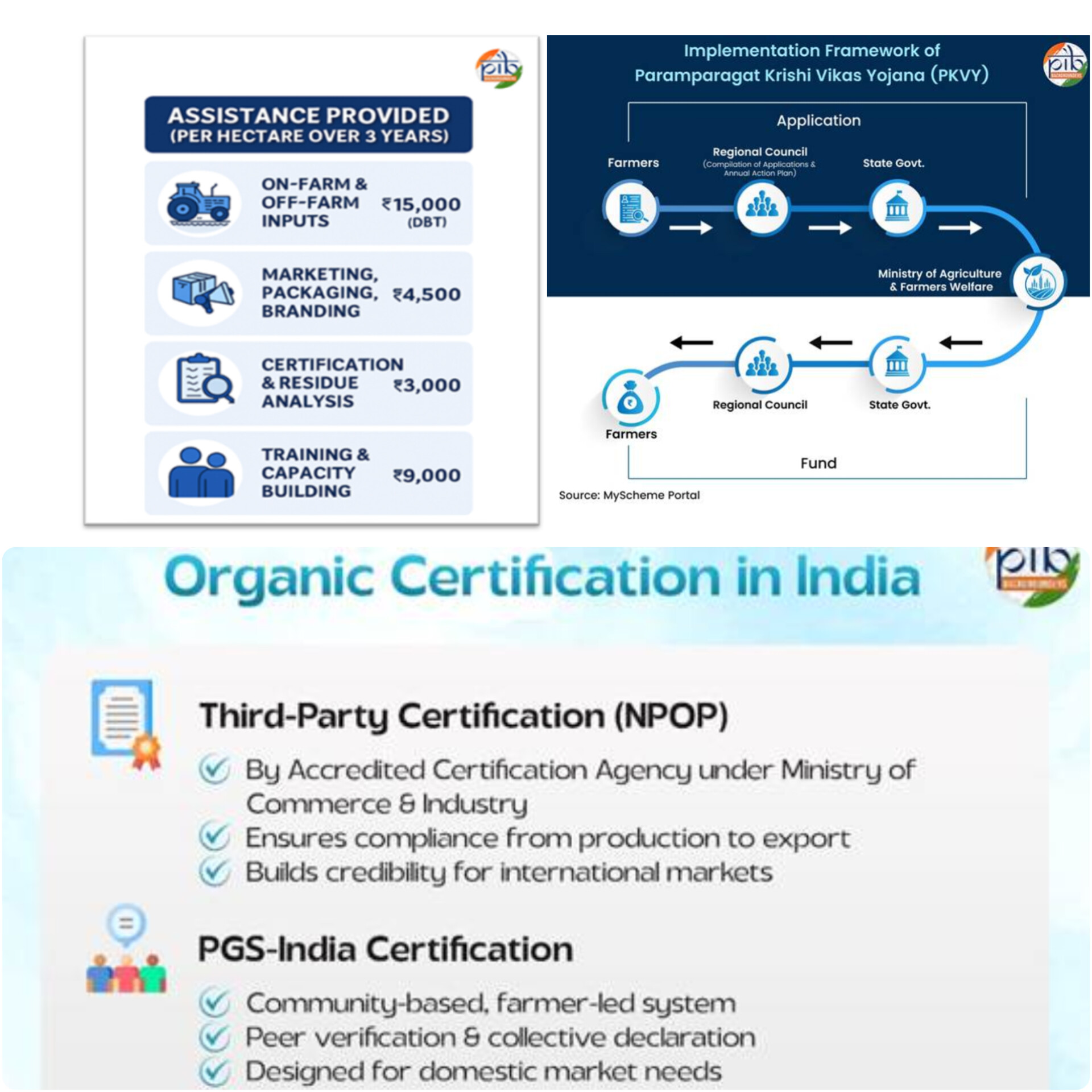 Under Paramparagat Krishi Vikas Yojana (PKVY), farmers adopting organic farming practices are being assisted with ₹31,500 per hectare for a three-year period. The support is structured as follows: